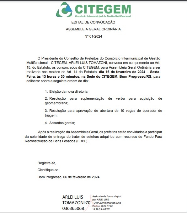 A diretoria do CITEGEM esteve reunida em Assembleia Geral no dia 16 de fevereiro. O evento ocorreu na sede do consórcio em Bom Progresso.
