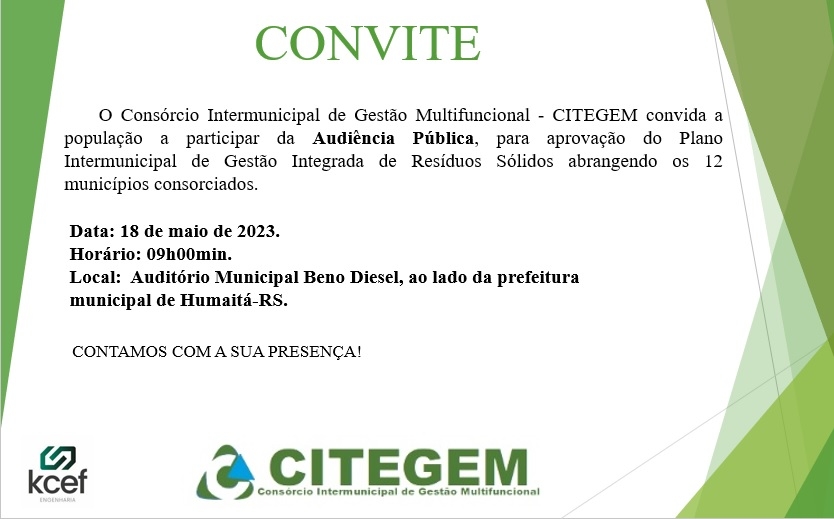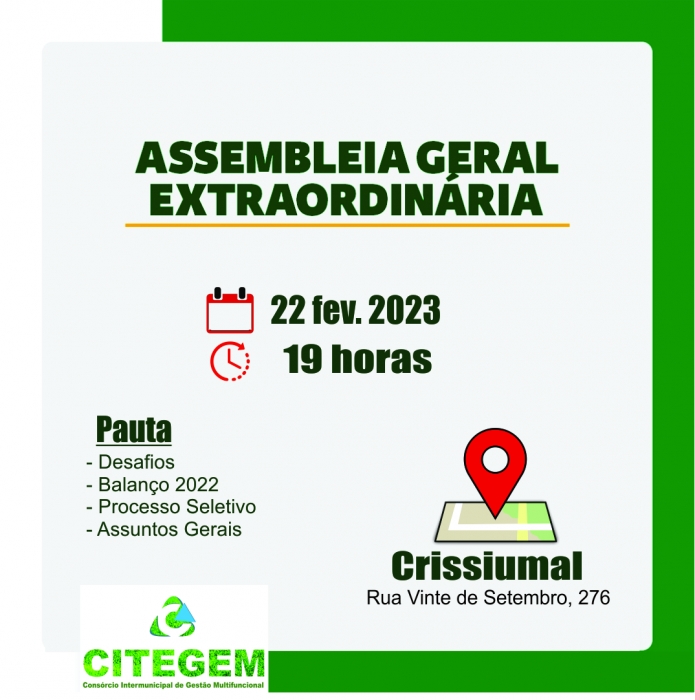 O Consórcio Intermunicipal de Gestão Multifuncional (CITEGEM), localizado na BR-468, esquina com a RS 207, no município de Bom Progresso, vai realizar no dia 22 de fevereiro sua Assembleia Geral Extraordinária.